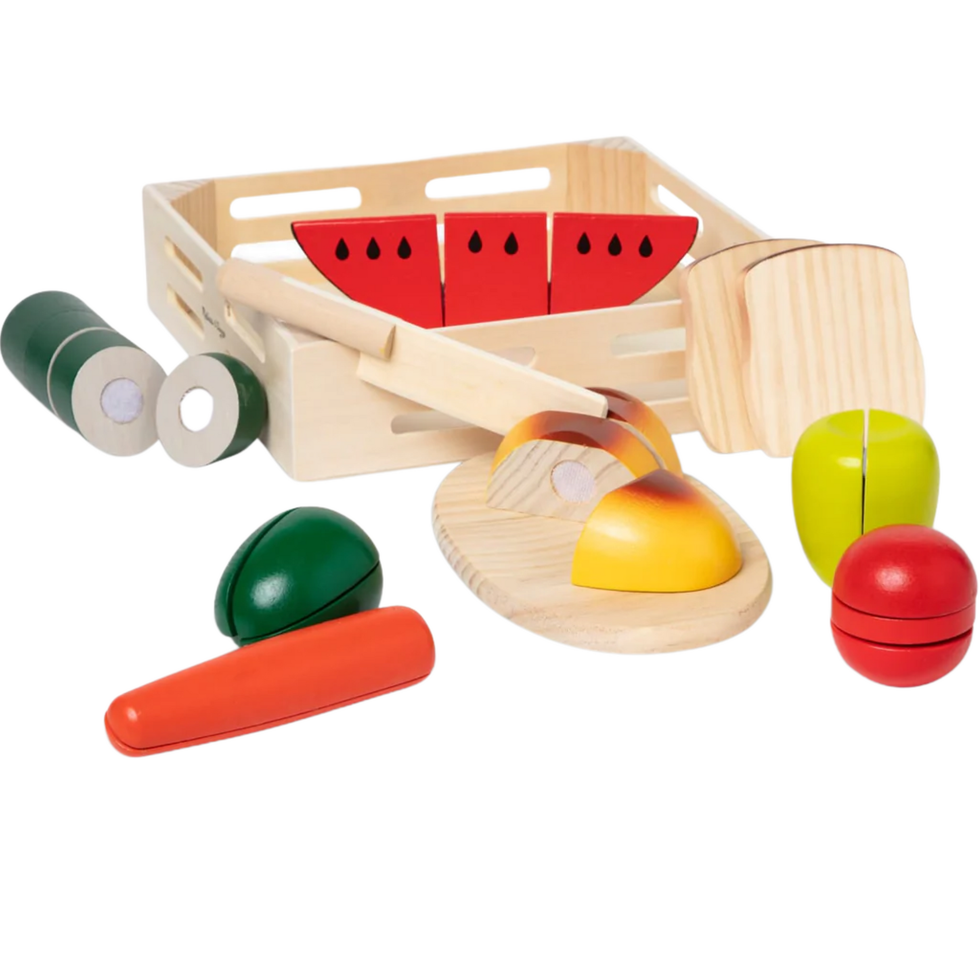 - Este juego contiene ocho piezas de comida de madera, una tabla para cortar y un cuchillo de madera. Cortar la comida es un "crujido" satisfactorio, y una introducción lúdica a los conceptos de "todo", "parte" y fracciones. • Las pestañas autoadhesivas mantienen las piezas juntas. • Perfecto para juegos de simulación e introducción de conceptos de parte y todo.