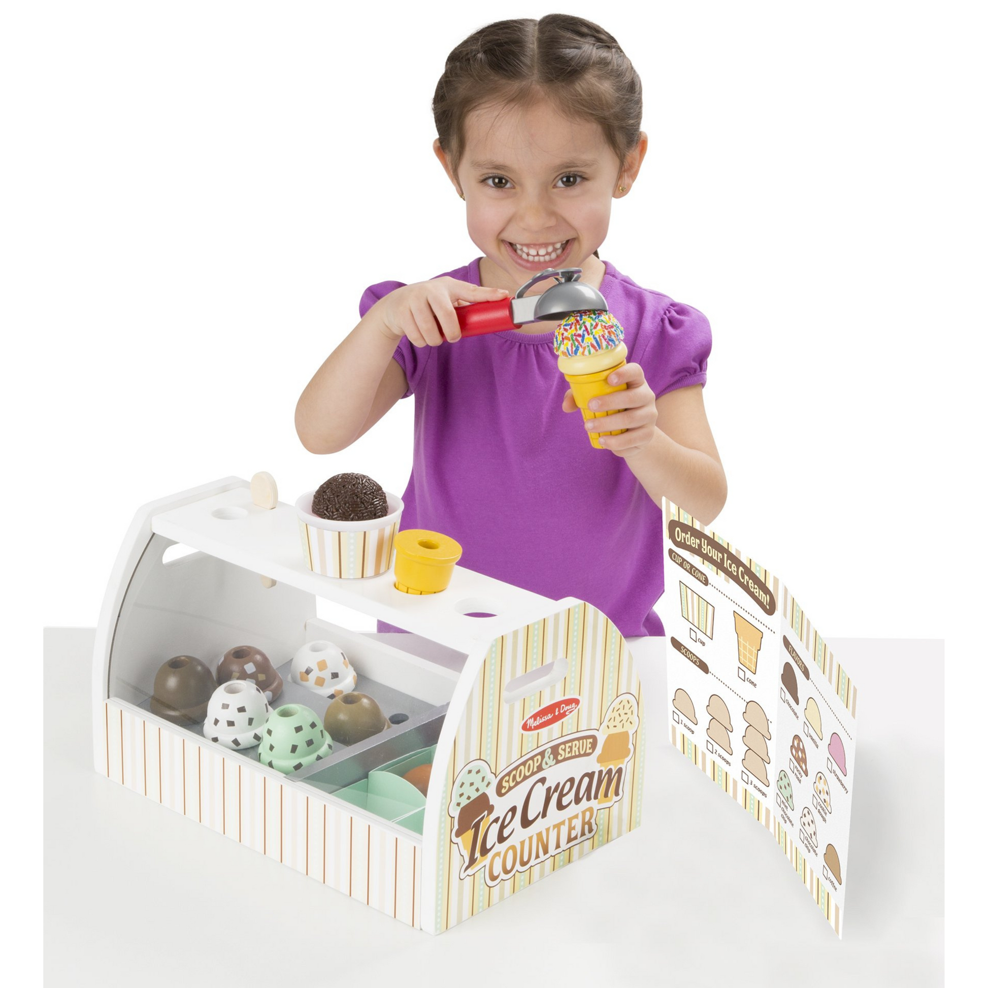 - ¡Recoge algunas golosinas geniales con este mostrador de helados de 20 piezas con todo incluido! El resistente mostrador de madera tiene capacidad para ocho bolas de madera de helado de diferentes sabores, seis coberturas variadas, dos conos, un vaso de plástico, una cuchara para helado y una cuchara de madera. La pala encaja en un orificio en la parte superior de las palas para levantar, apilar y soltar. ¡Tome pedidos en la tarjeta de menú reutilizable y sirva una deliciosa diversión! • Juego de helados de madera de 28 piezas. • Incluye mostrador de helado de madera, ocho bolas de helado, seis coberturas, dos conos, taza, cucharón, pinzas, cuchara de madera y seis billetes de $1.