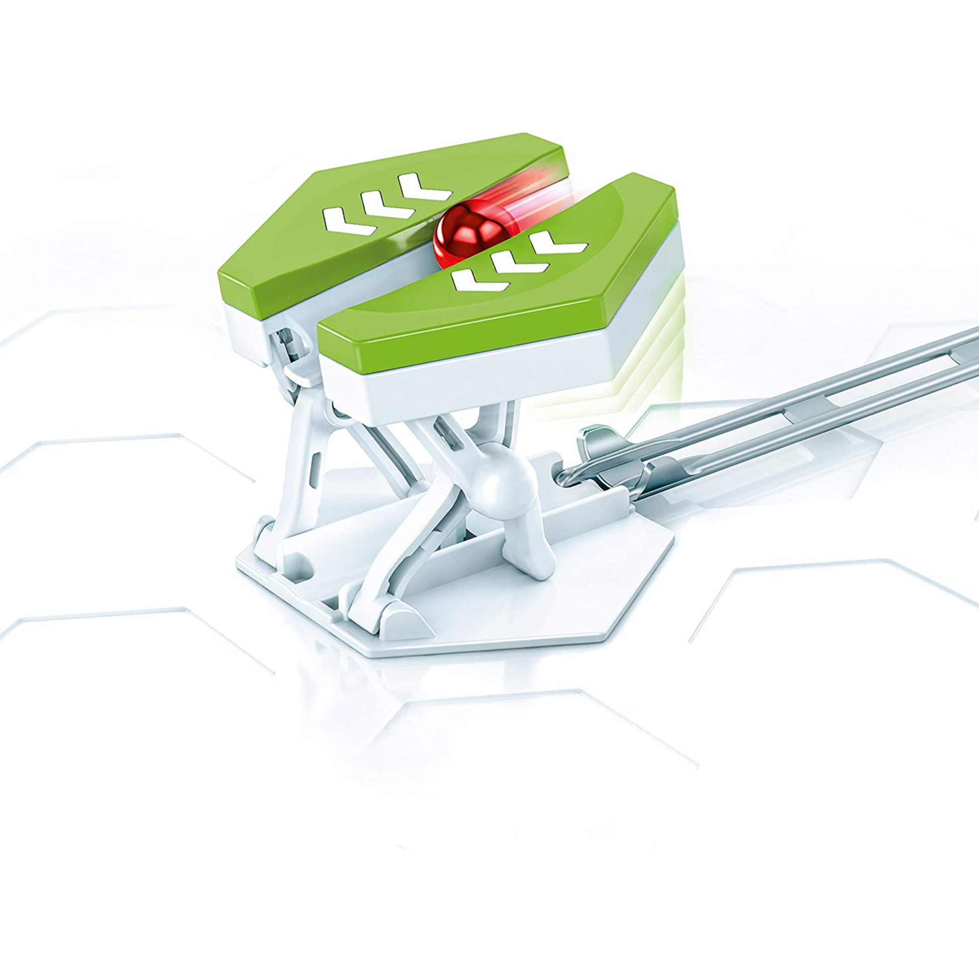¡Lleva la canica a un nuevo nivel de altura! El Saltador lleva tu canica a un nivel superior y crea a la vez un túnel de paso. ¿Cómo dividirás las rutas de tus canicas con el Saltador? *Para utilizar esta expansión se requiere el Starter-Set de la línea GraviTrax.