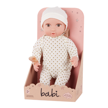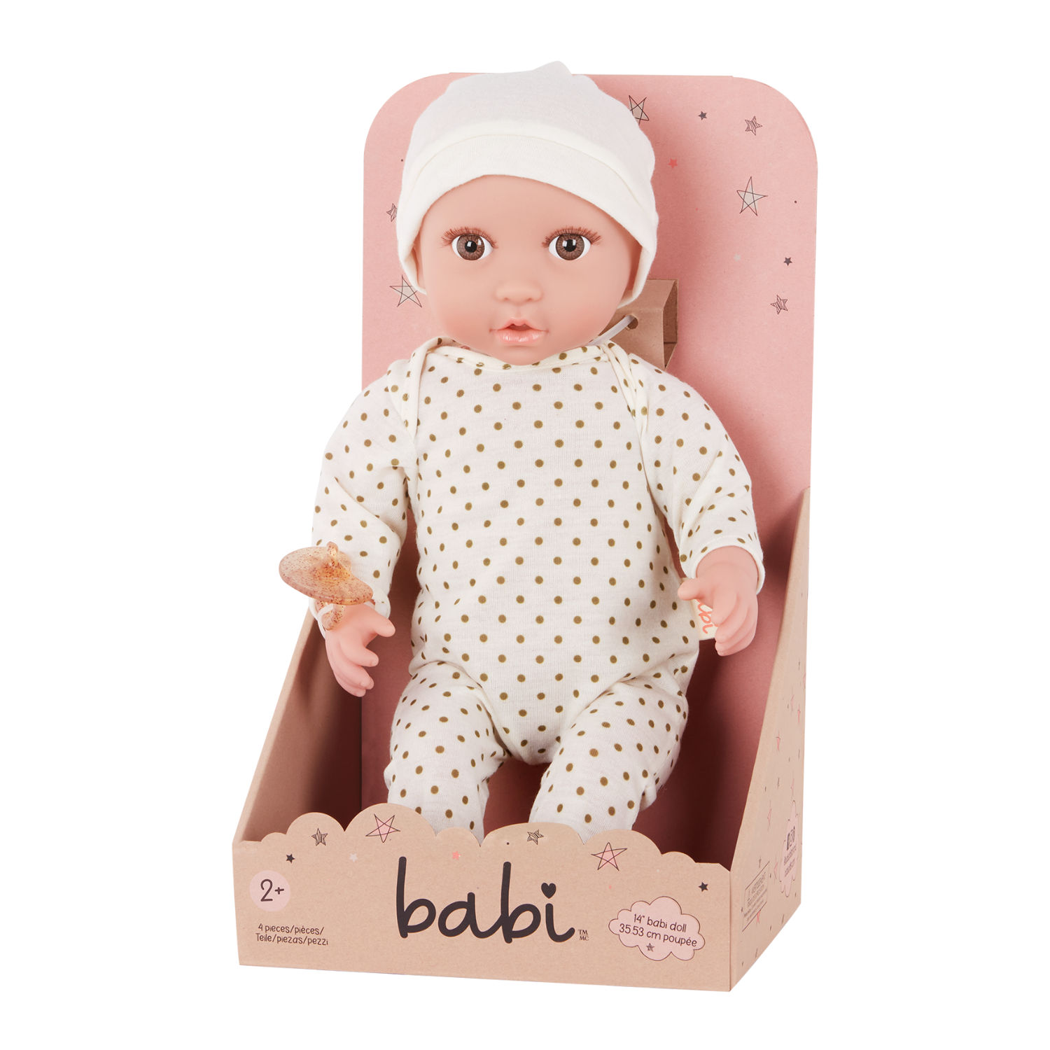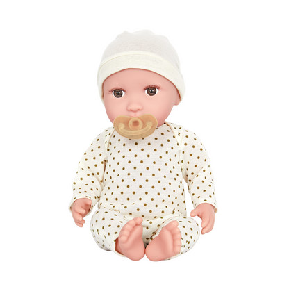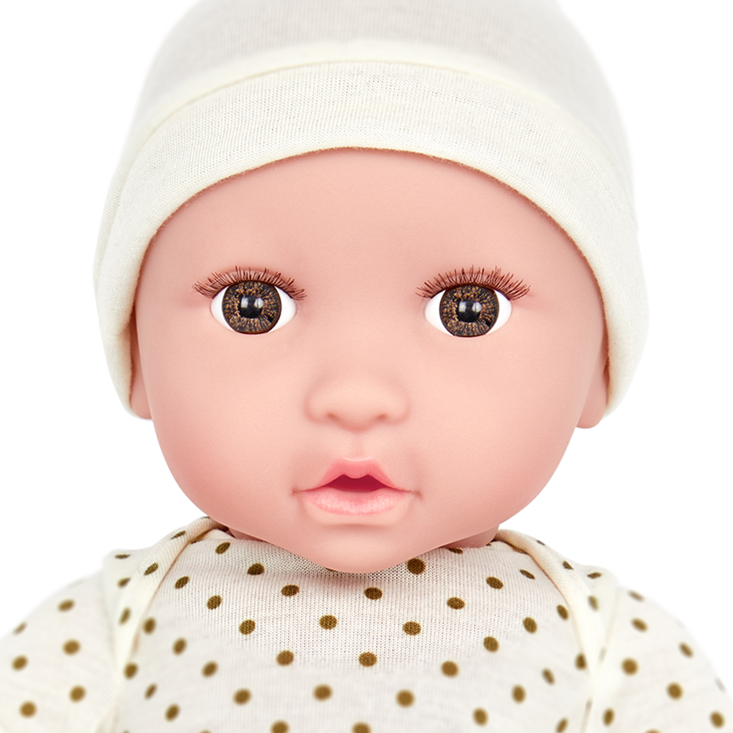 - Descubra tiernos momentos de juego con una adorable muñeca bebé recién nacida con hermosos ojos marrones, pestañas suaves, rostro realista con manos y pies detallados y un cuerpo suave y abrazable. Este adorable bebé está acurrucado en un cómodo pijama de lunares con una abertura fácil para ponérselo y quitárselo rápidamente cuando es hora de acostarse. ¡Y el suave gorro blanco y el accesorio con el chupete extraíble ayudan al bebé a dormir! ¡Colecciona el parque infantil, la carriola de viaje y otros accesorios de guardería bellamente diseñados para cuidar a tu bebé en casa y mientras viajas! Muñecos no cierran los ojos.