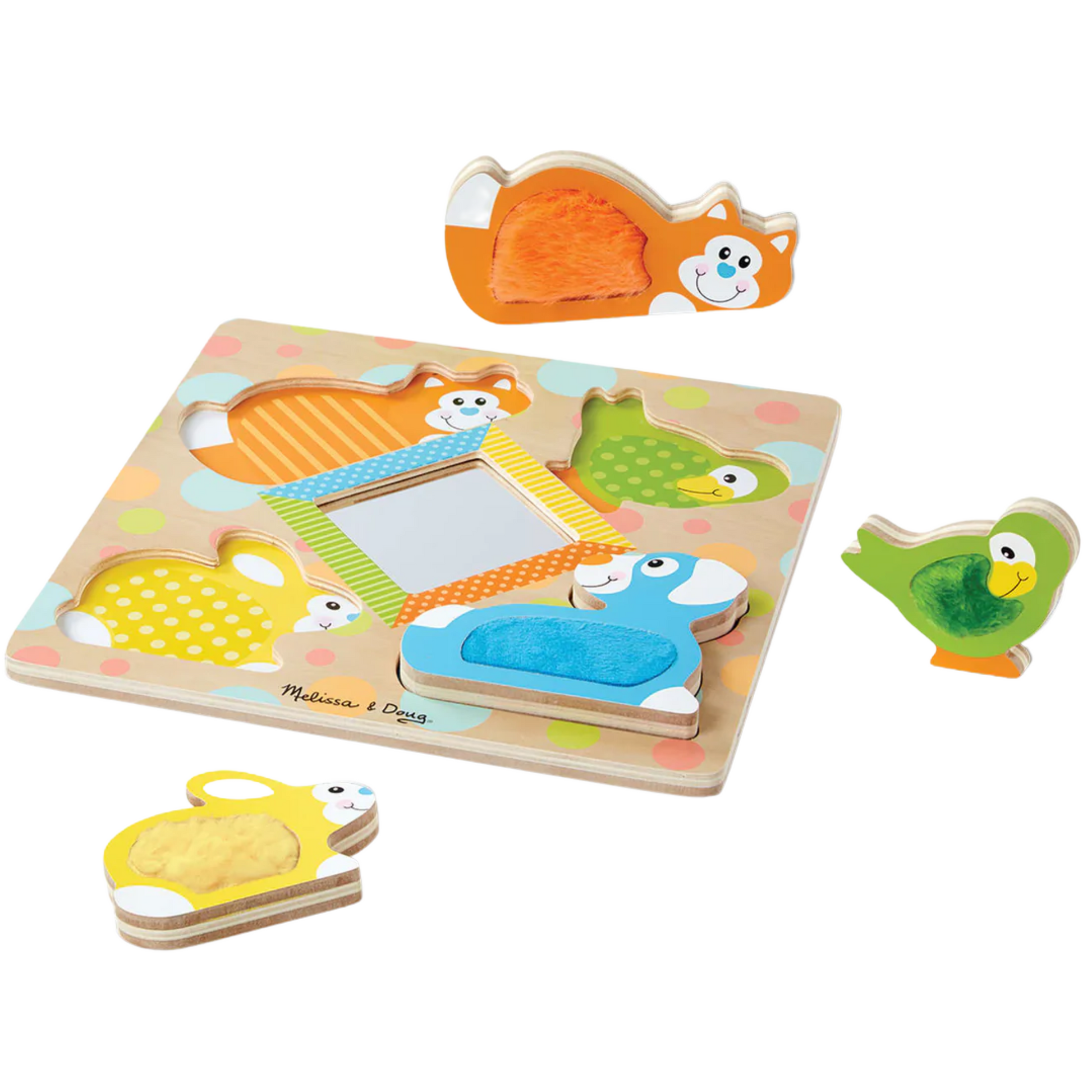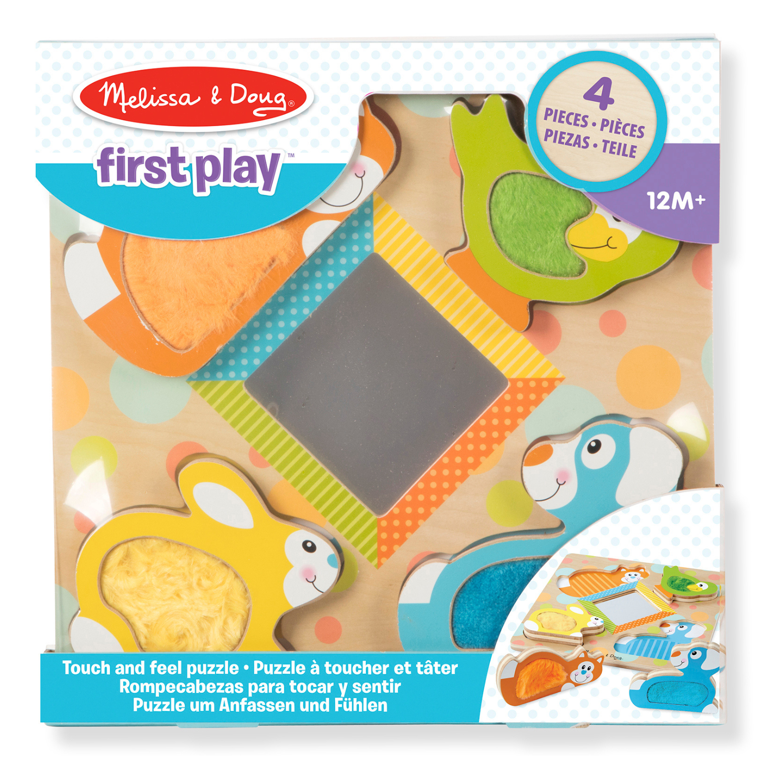 ¡Siempre hay una cara sonriente mirando hacia atrás desde este rompecabezas grueso con espejos! Estimule los sentidos con cuatro amigos animales peludos y que se ponen de pie para jugar a fingir o encajan en el resistente tablero de rompecabezas de madera, que rodea un espejo seguro para niños. Los bebés y los niños pequeños se deleitarán al descubrir colores y patrones mientras desarrollan habilidades motoras finas. Los rompecabezas y juguetes de First Play cuentan con colores brillantes, patrones llamativos y diseños caprichosos que aumentan las habilidades mientras despiertan la imaginación y el asombro, ¡desde el principio!