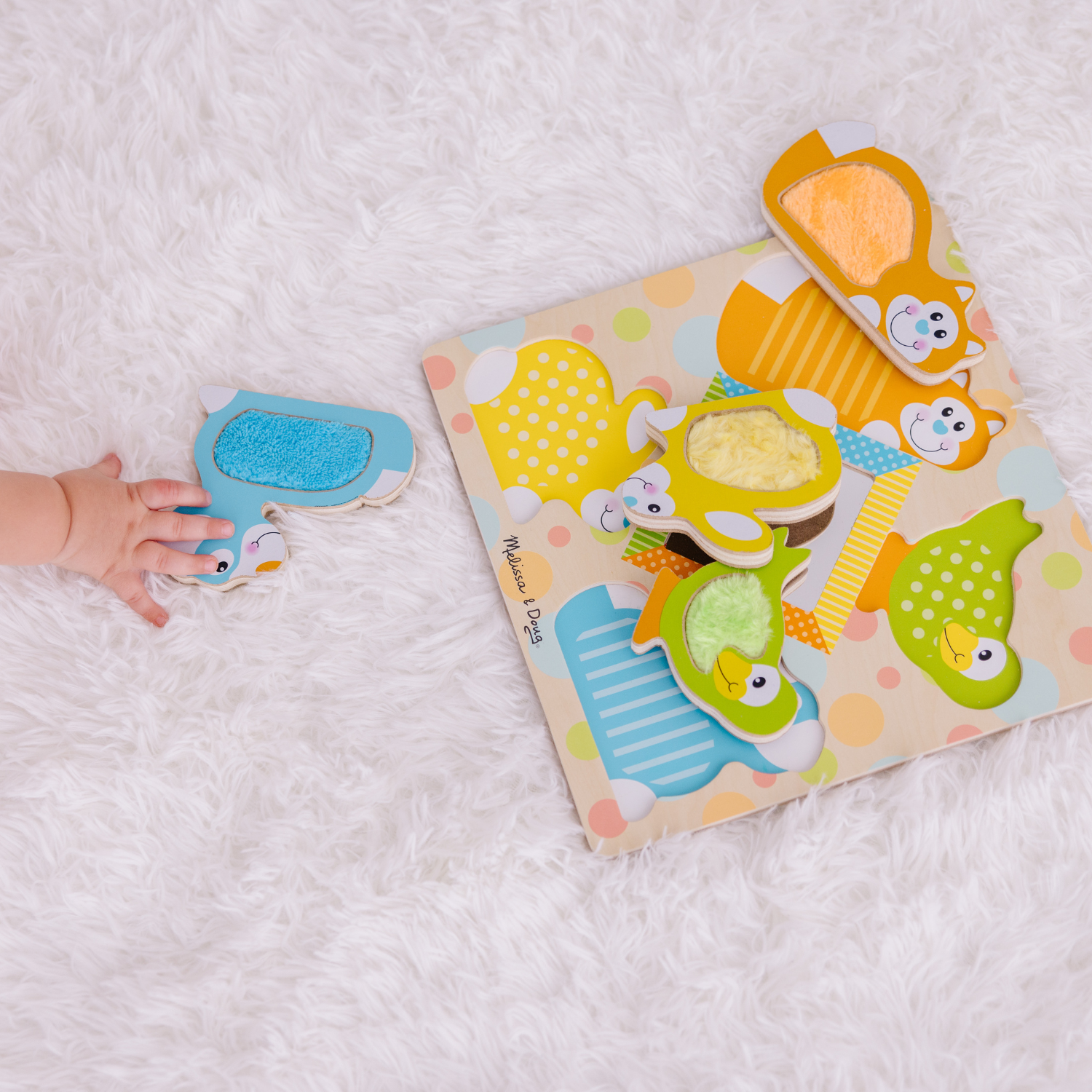 • Las piezas incluyen gatito, cachorro, conejito y pájaro texturizados.