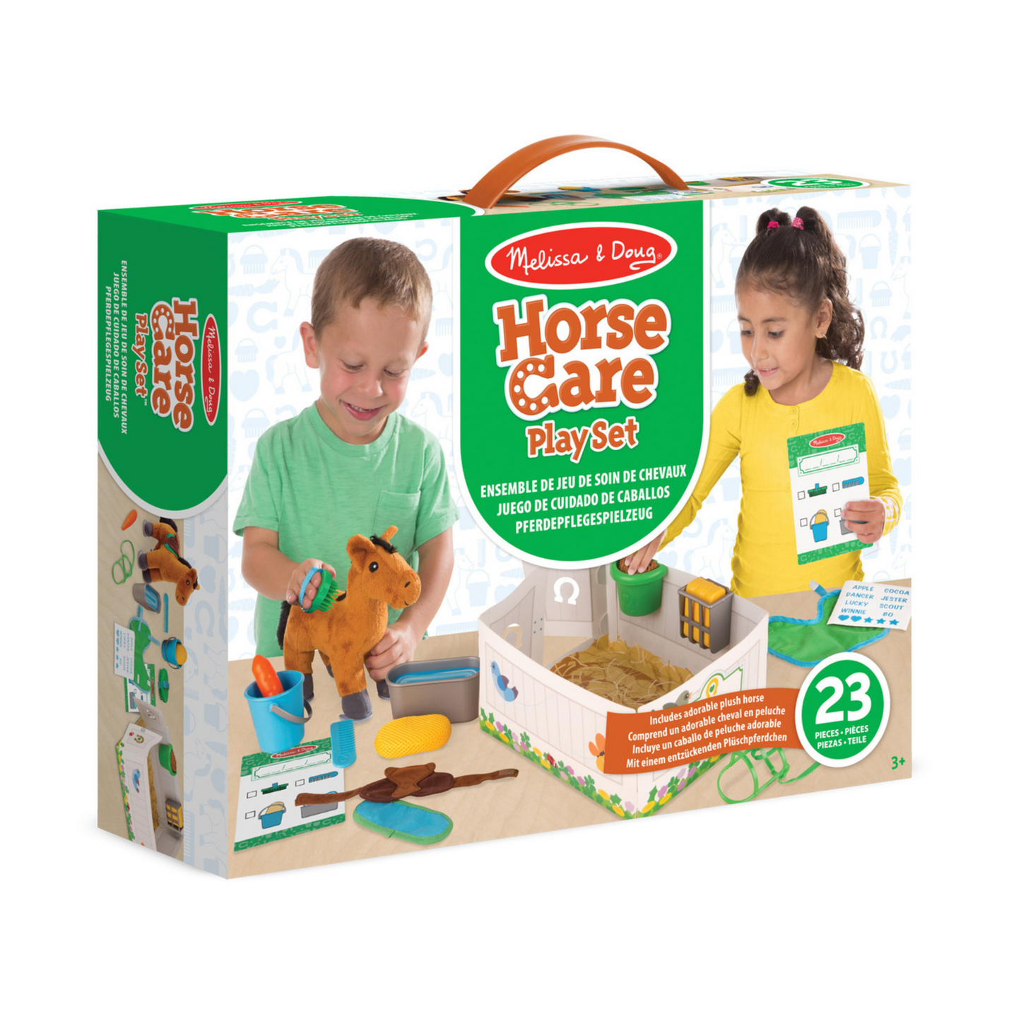 ¡Ánimo, compañero! Los niños mayores de tres años tendrán todo lo que necesitan para cuidar a un caballo de peluche (incluido) y mantenerlo bien alimentado y en buen estado. Trae los accesorios realistas de alimentación, aseo y equitación para caballos. Además, puedes llevar un registro de las responsabilidades diarias con una lista de verificación reutilizable y agregue un toque personal con etiquetas de nombre y calcomanías para el puesto de cartulina plegable y plegable reversible que también puede almacenar todos los accesorios y suministros para caballos. • Juego de cuidado de caballos de simulación de 23 piezas con caballo de peluche y accesorios de alimentación y aseo. • Incluye herraduras, cepillo, peine, cubeta de lavado, esponja, grano, heno, contenedor de pellets, soporte para heno, bebedero, inserto de agua de doble cara, almohadilla para silla de montar, silla de montar, brida, manta para caballos y calcomanías con nombres.