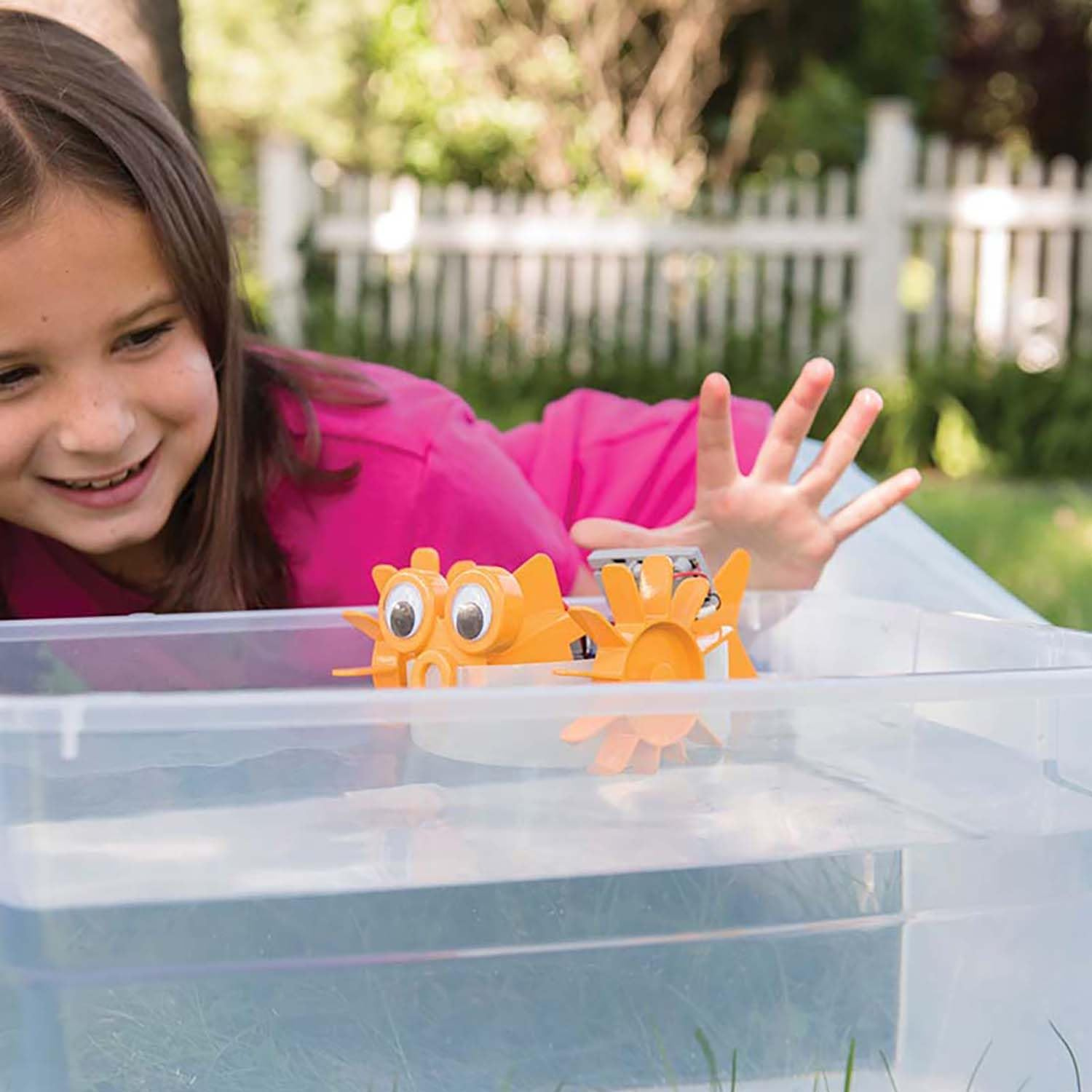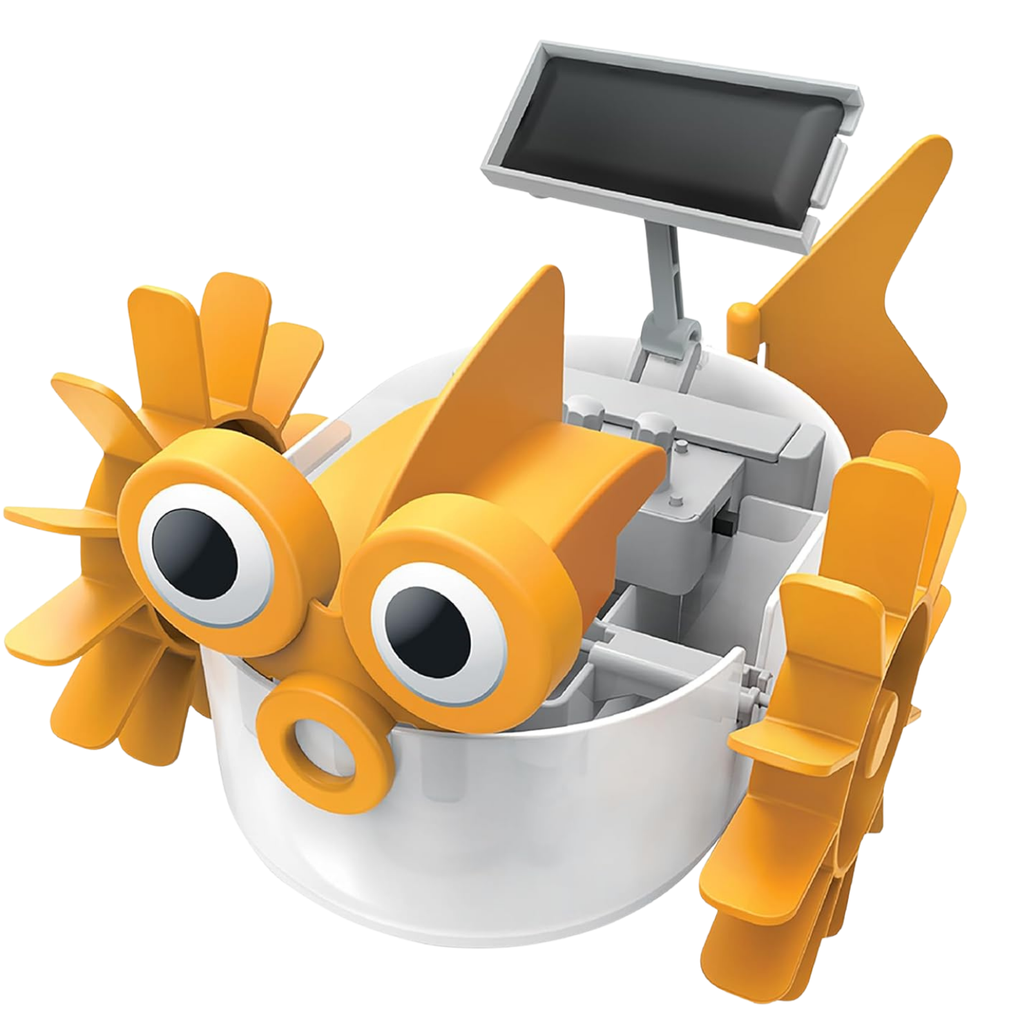 Construye tu propio robot acuático y observa cómo nada utilizando energía solar o una batería. Este kit combina robótica y ciencia para enseñar de forma práctica cómo funcionan las fuentes de energía renovable en situaciones reales.