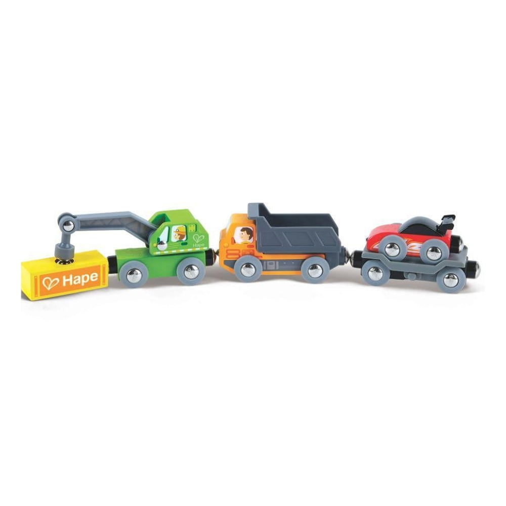 Set de vehículos técnicos 3 en 1. Incluye una grúa verde con carga, un camión naranja y un remolque con un coche deportivo rojo. Los vehículos son compatibles con todos los trenes Hape y, gracias a sus imanes, se pueden acoplar a cualquier circuito. Fabricados con madera y plástico FSC de alta calidad.