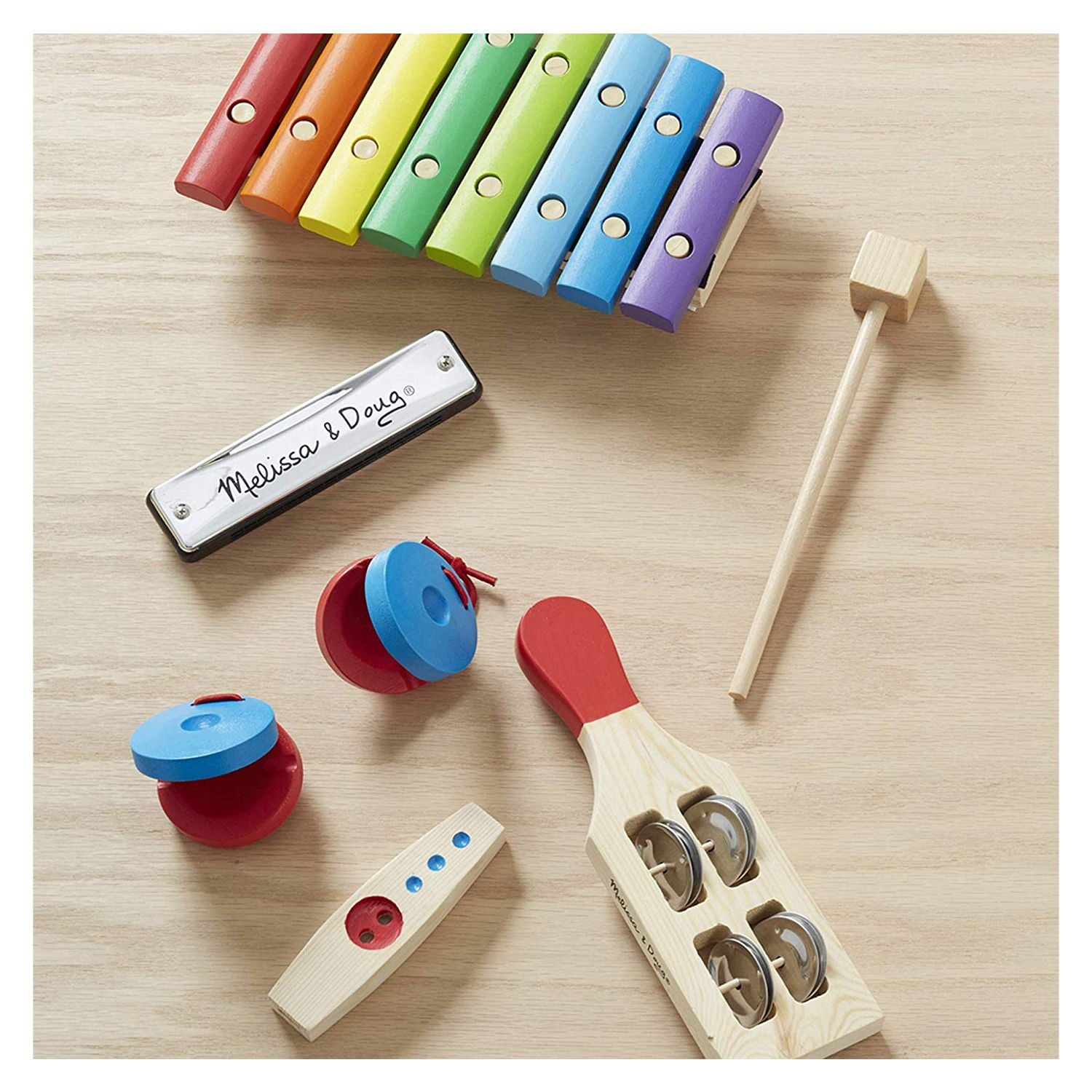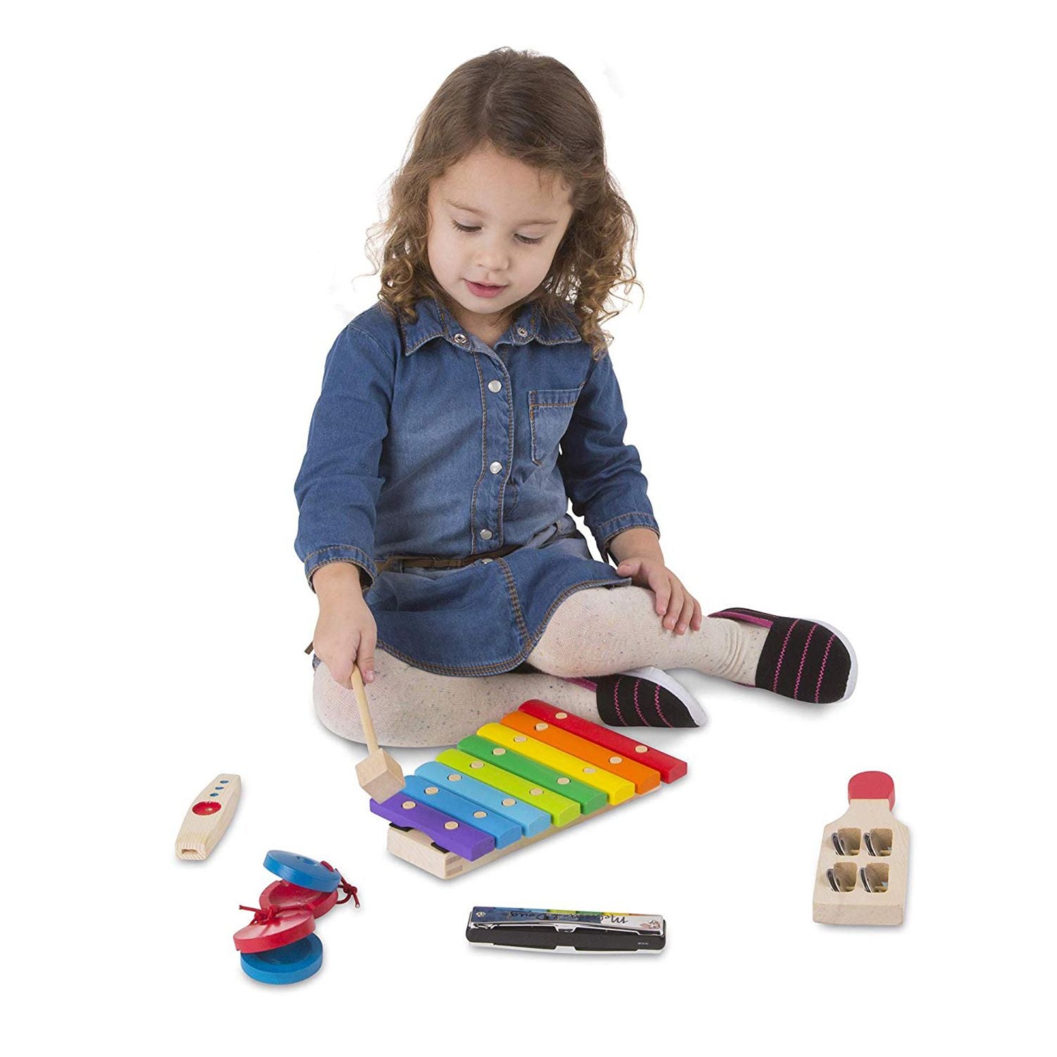 ¿Tienes música? Todo lo necesario para una actuación en solitario o para formar una banda de música. ¡Cuenta con un xilófono, un kazoo, castañuelas, una armónica y un jingle stick en una caja de madera! Ideal para involucrar a preescolares en la experiencia musical.