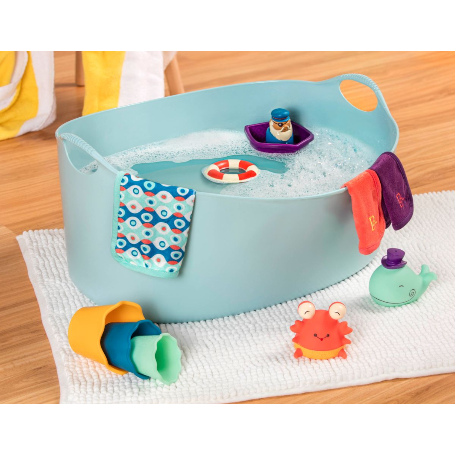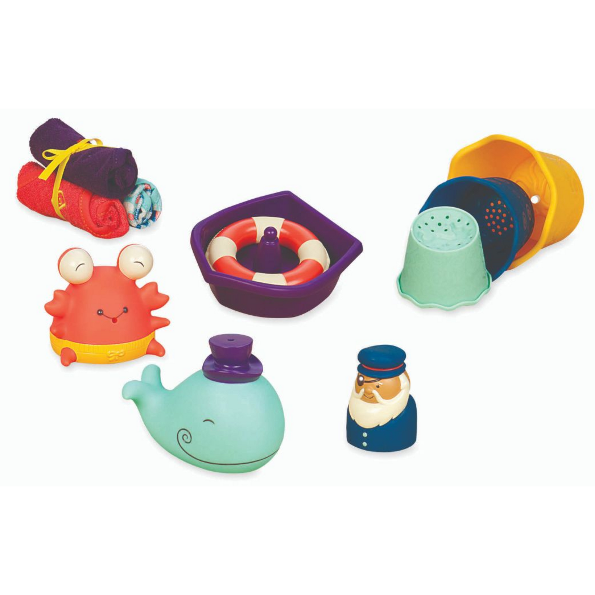 Incluye: este juego viene con 2 chorros de baño, 1 bote, 1 capitán, 1 flotador, 3 vasos anidados y 3 paños suaves.