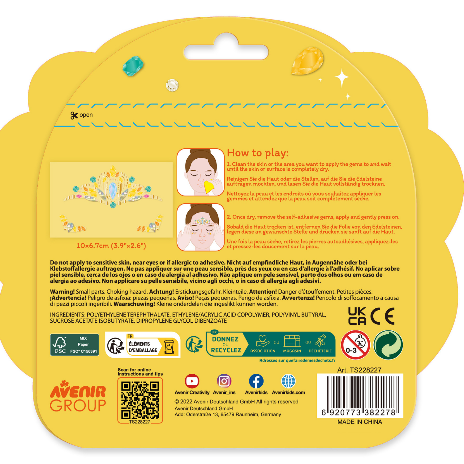 Limpie la piel o la zona donde desee aplicar las gemas y espere a que la piel o la superficie esté completamente seca; Una vez secas, retire las gemas autoadhesivas, colóquelas y presione suavemente.No apto para niños menores de 3 años.