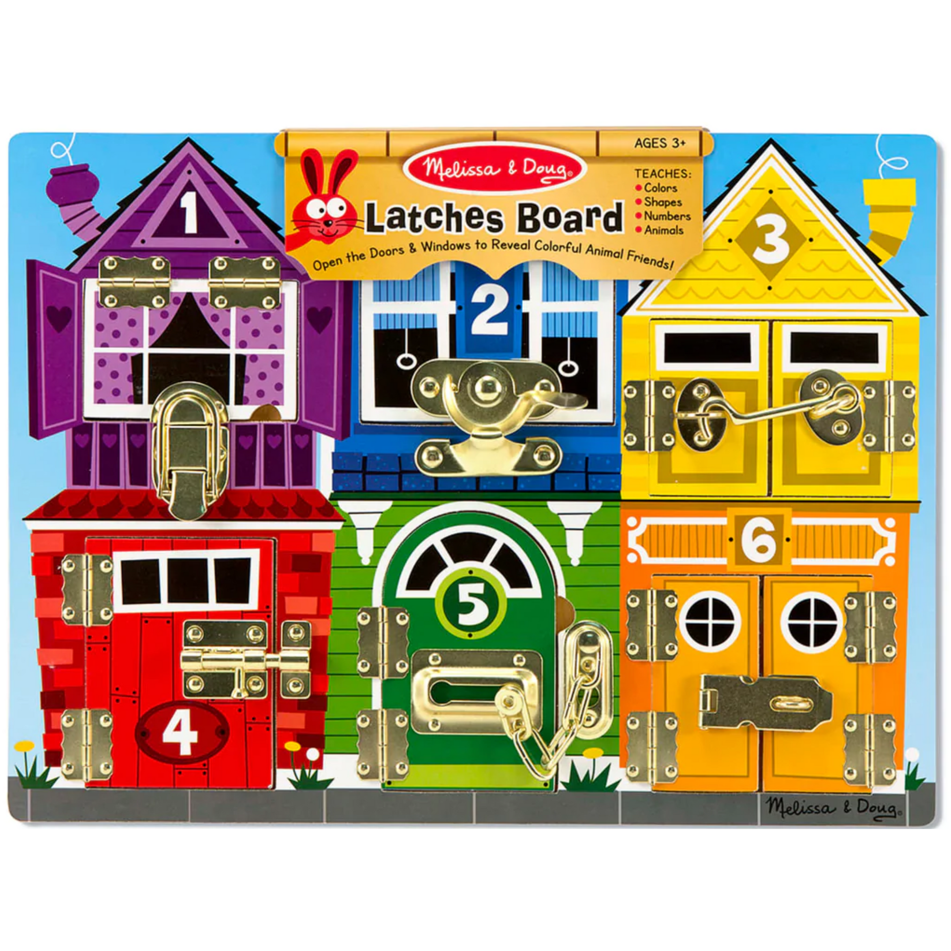 ¡Desabroche un pestillo, abra la puerta numerada y diviértase cuando la imagen de abajo se revele en este tablero de madera! El tablero de juegos de actividades ayuda a los niños a desarrollar destreza mientras descubren cómo funcionan 6 pestillos diferentes.