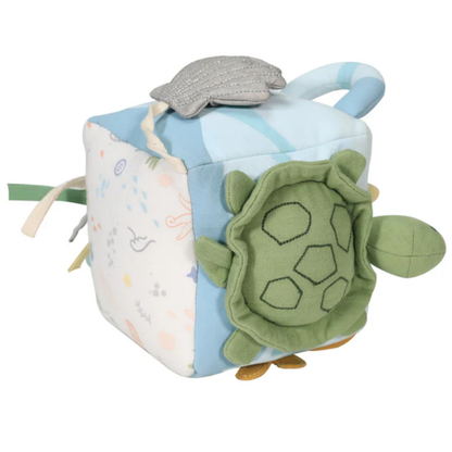 Este suave y pequeño cubo de actividades orgánico con animales del océano contiene muchas actividades que estimulan los sentidos del bebé. Hay mucho para descubrir y jugar: diferentes texturas, un espejo, un sonajero y un chirriador que emiten sonidos con cada movimiento. También hay una pequeña tortuga a la que le gusta jugar tirando de su cola. Este juguete sigue siendo interesante y garantiza momentos divertidos.